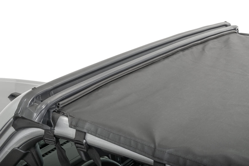 Each Bimini Plus attaches to your Wrangler JL 4-Door without the use of any extra components. Attaching with durable vinyl straps with reinforced buckles and to factory mounting points on the roll bar, this top goes on and off like a breeze.