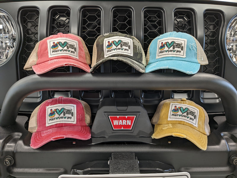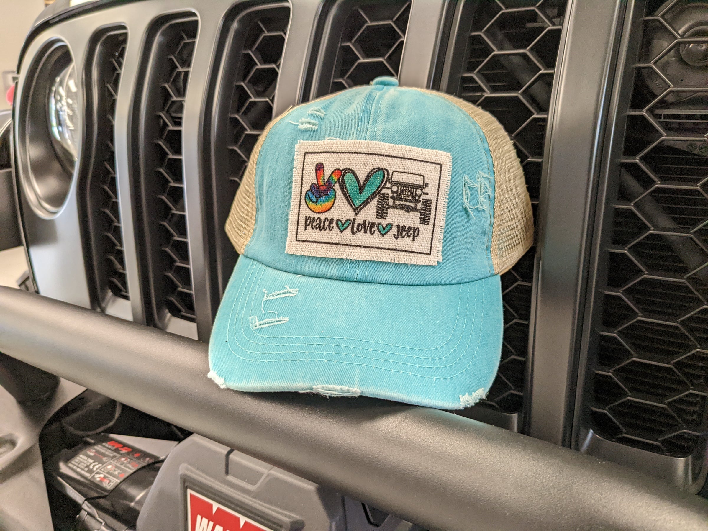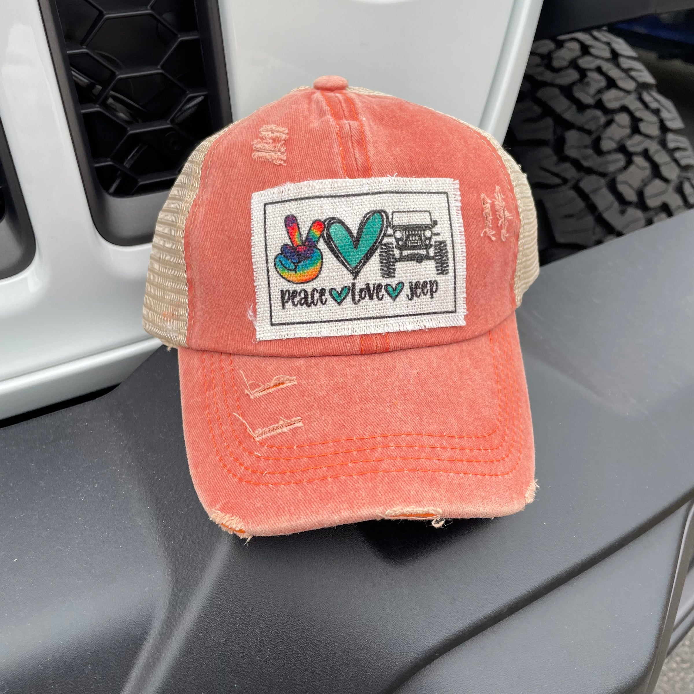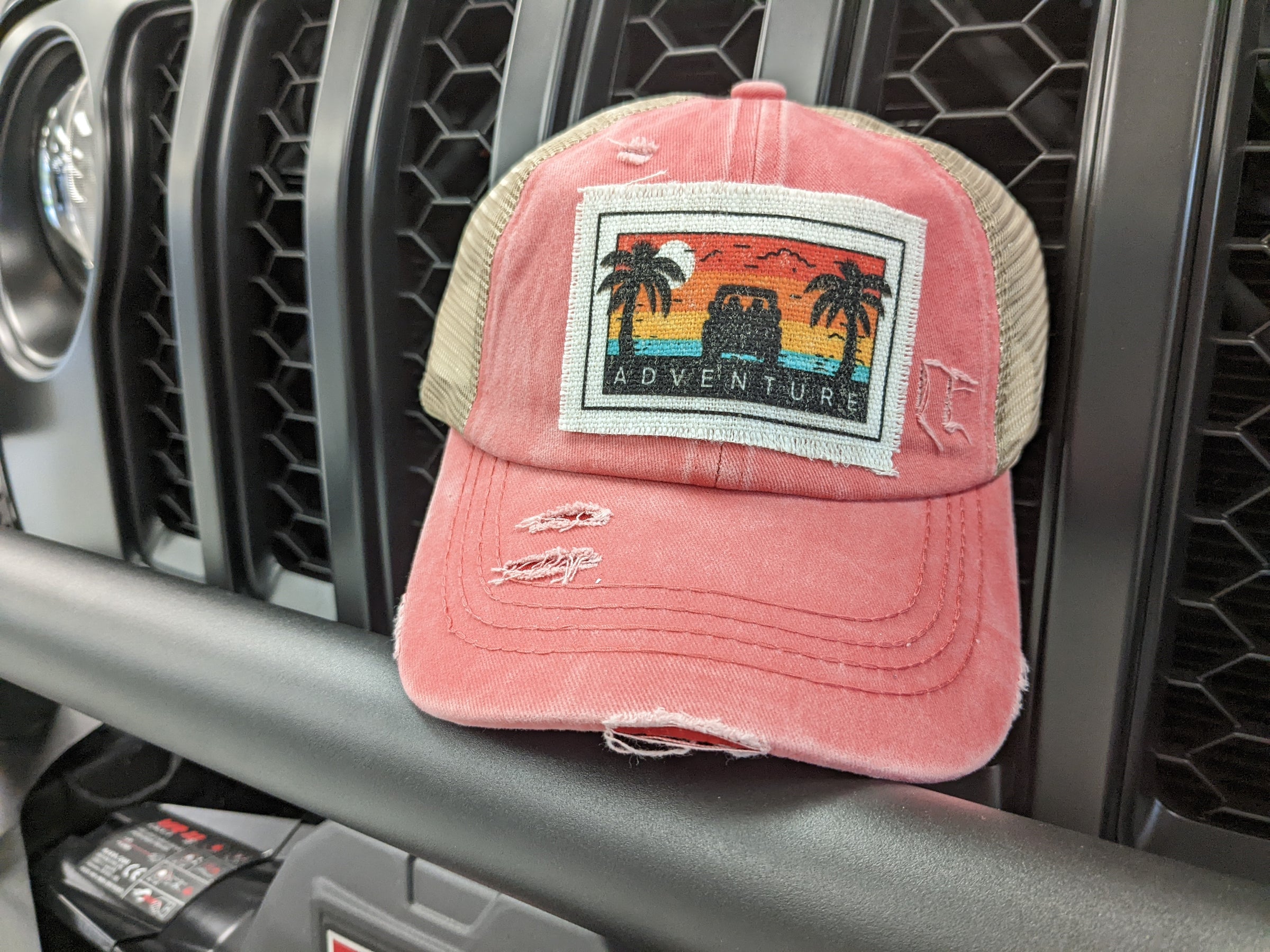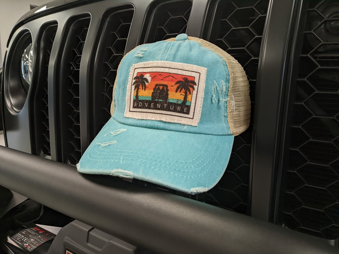 Our Mesh, trucker-style elastic Ponytail Jeep Hat comes pre-distressed so you don't have to break it in. You'll love the different ponytail options with the criss-cross design. Choose your hat color and design, or better yet, buy more than one! Your new go-to hat off-road and on makes a great gift as well!