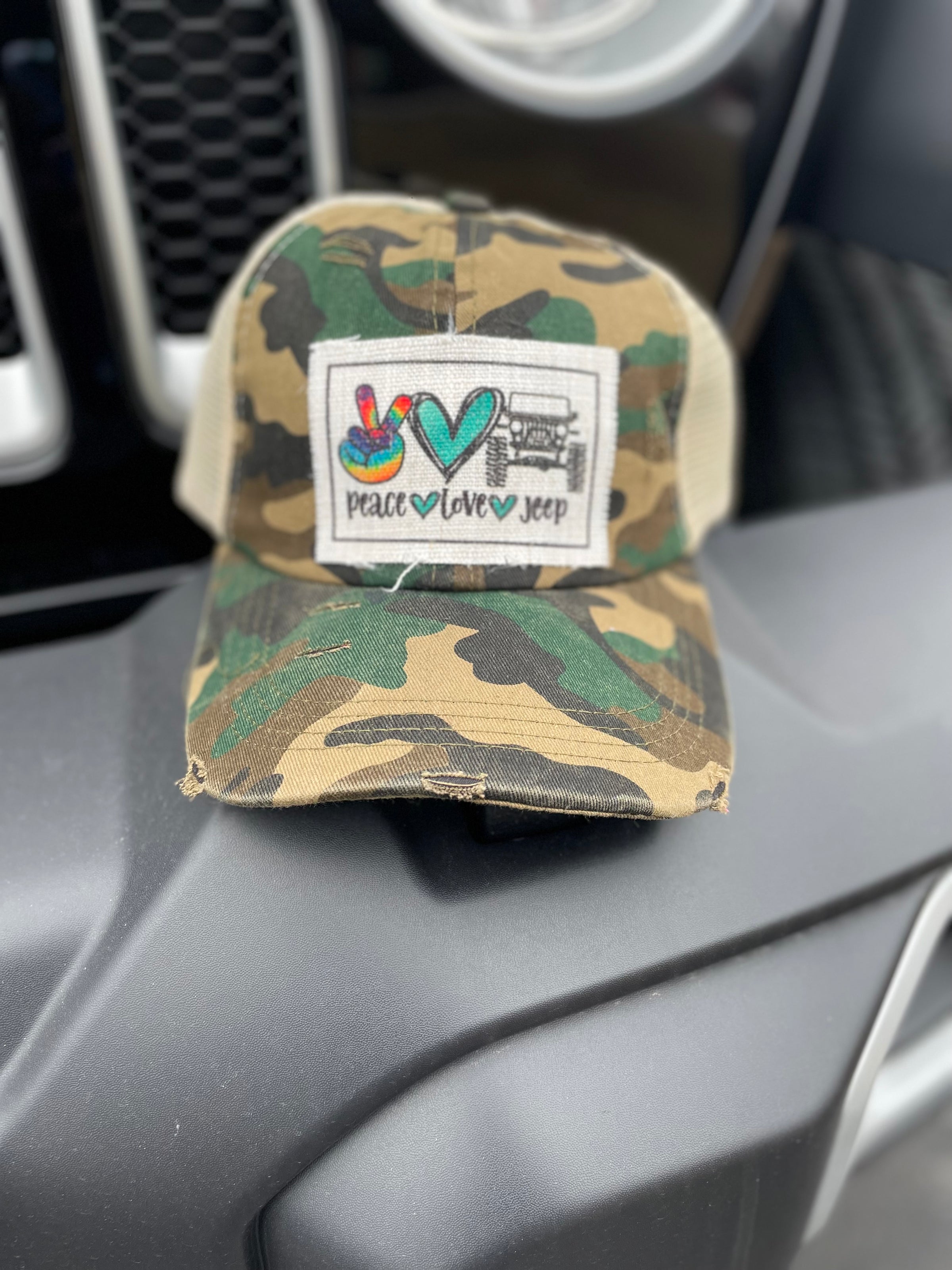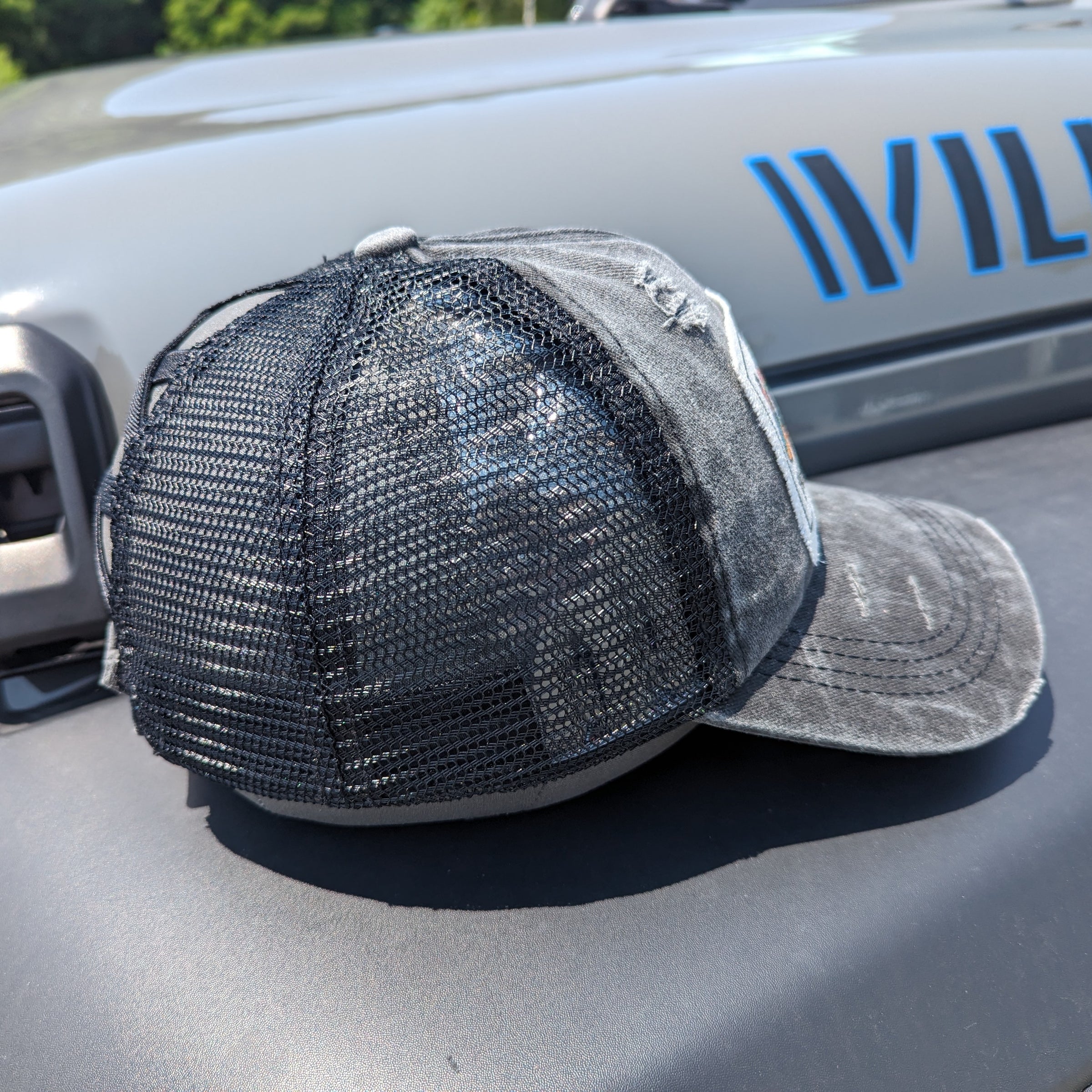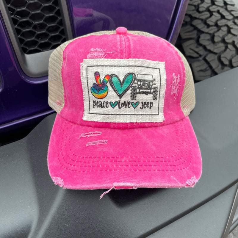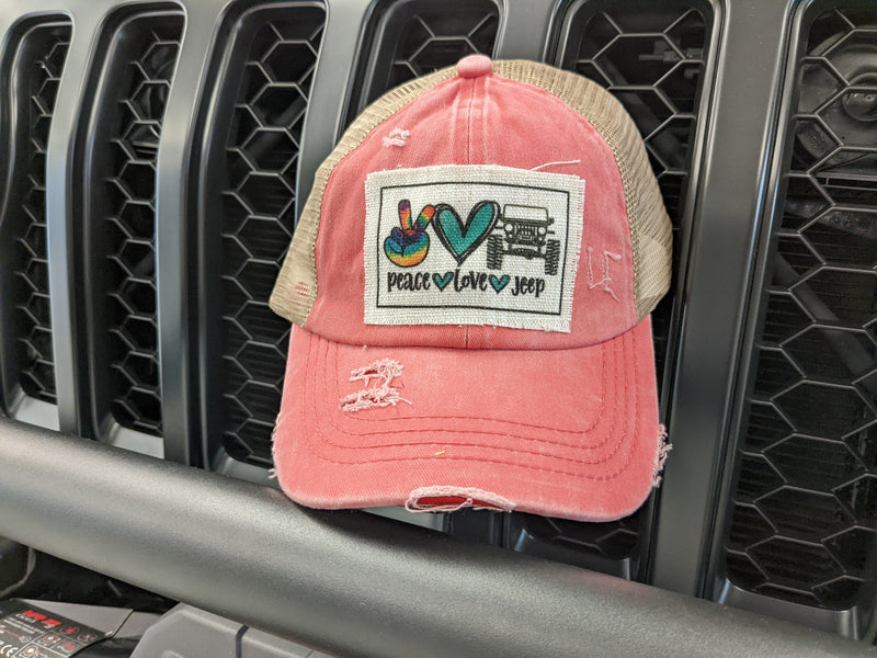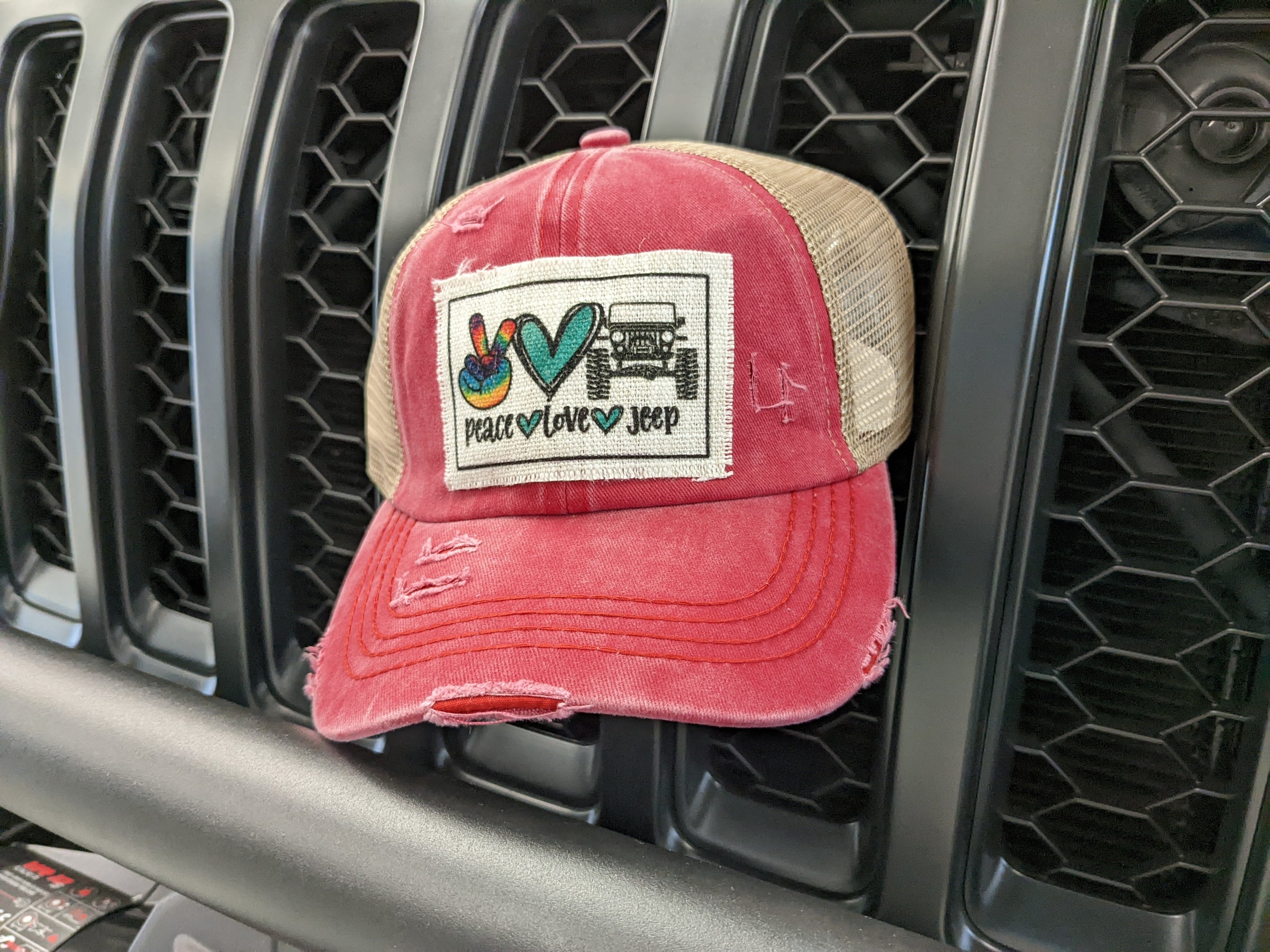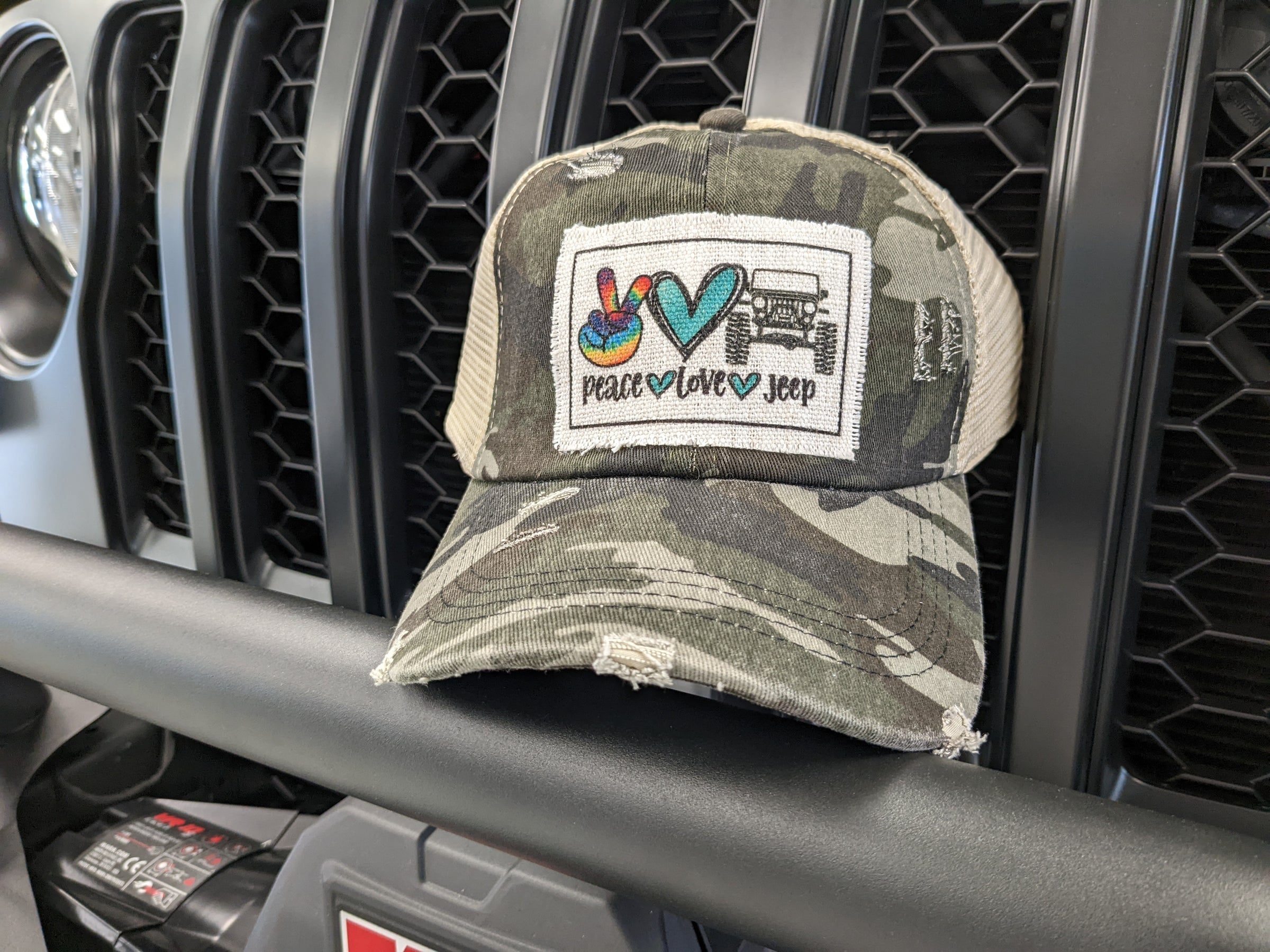 Our Mesh, trucker-style elastic Ponytail Jeep Hat comes pre-distressed so you don't have to break it in. You'll love the different ponytail options with the criss-cross design. Choose your hat color and design, or better yet, buy more than one! Your new go-to hat off-road and on makes a great gift as well!