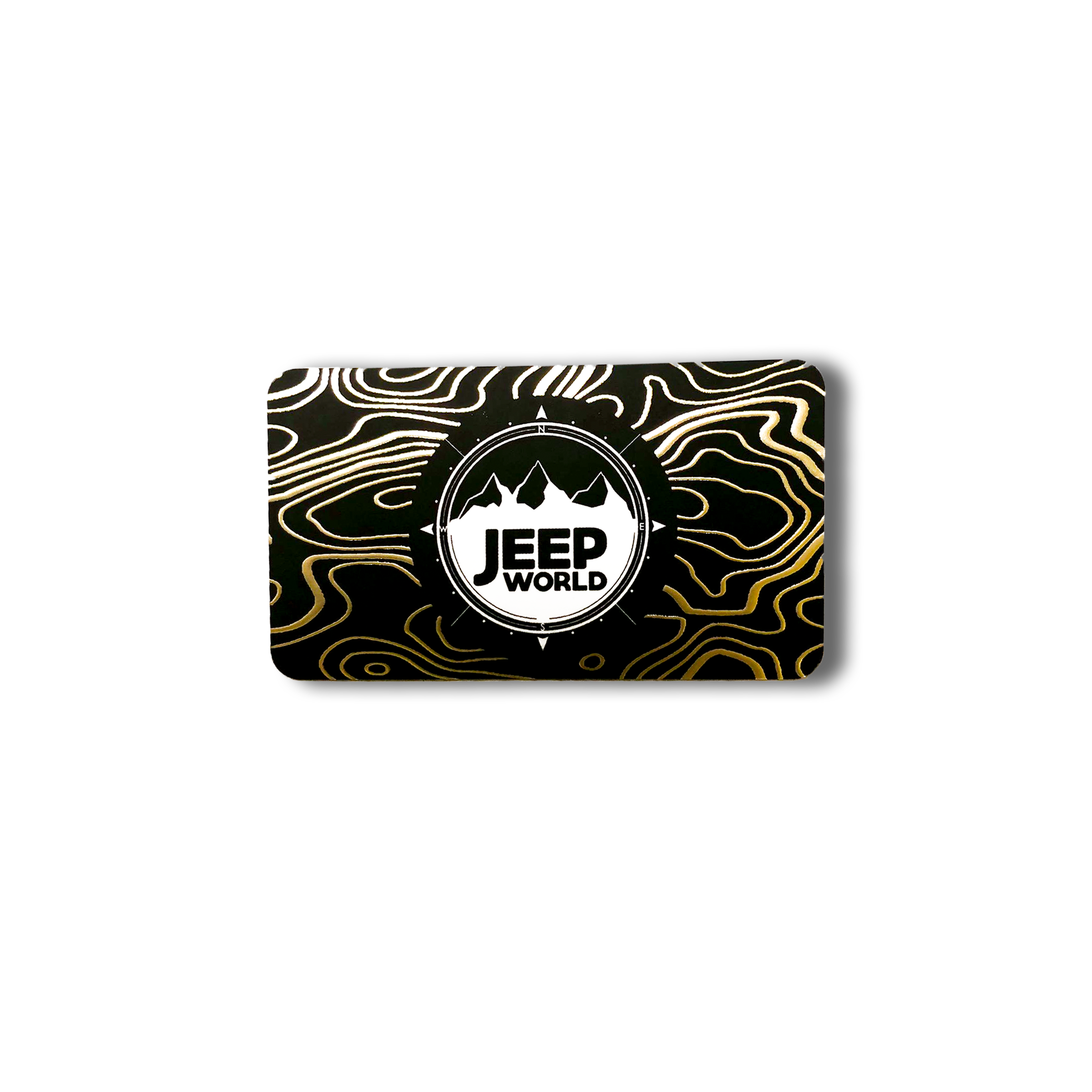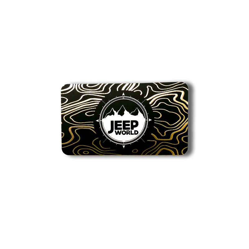 Shopping for a Jeep Owner or a Jeep fan but not sure what to give them? Give them the gift of choice with a Jeep World gift card! Gift card features gold topographic map print on front & gold lettering amount on back. Color option: black & gold.