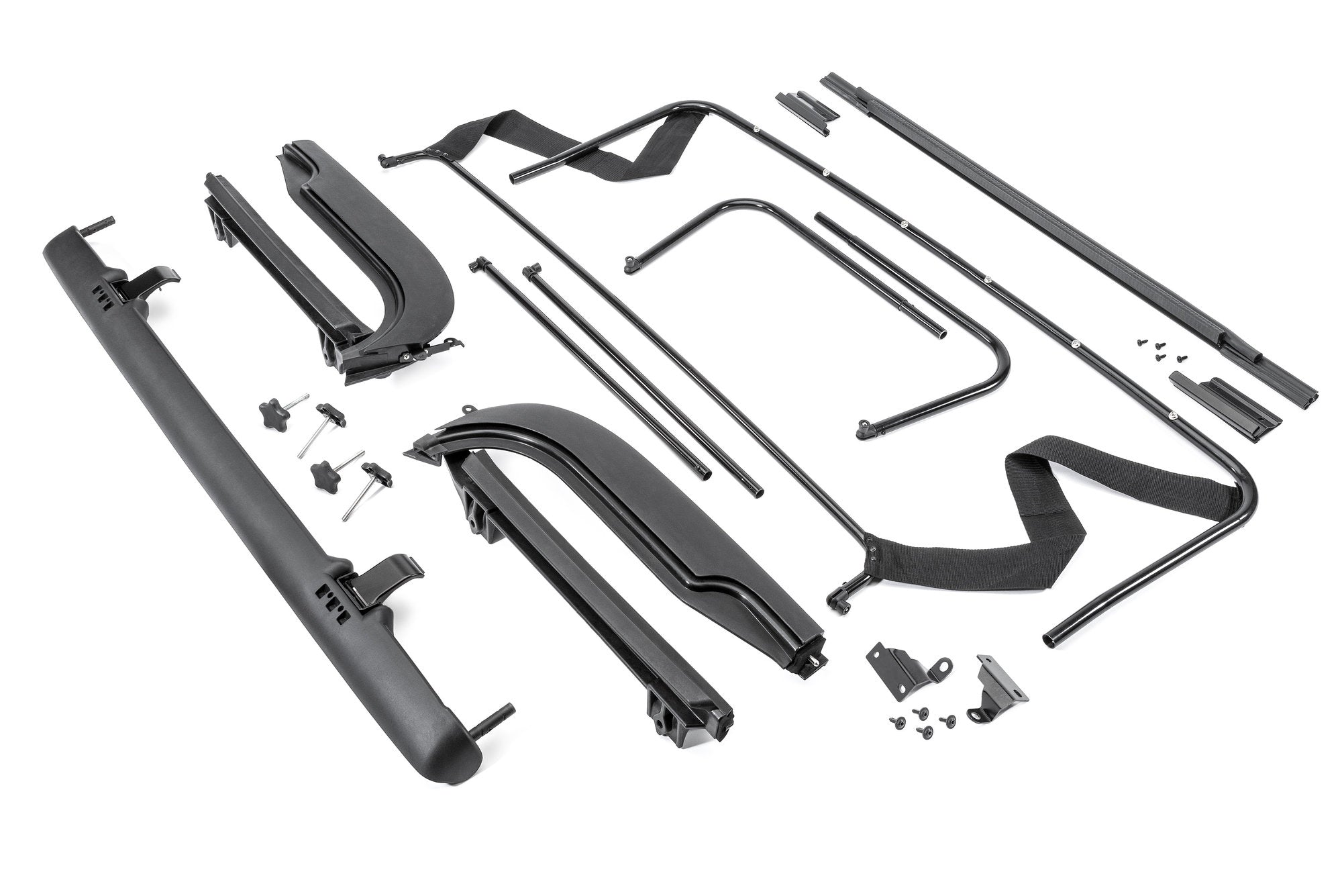 Easily replace your original and most likely worn down soft top hardware with a brand new Factory Style Bow Assembly replacement from MasterTop. This complete replacement bow assembly includes all of the necessary components that make up the soft top hardware, including new door surrounds, bows, factory style windshield header and tailgate bar for your Wrangler TJ. This new design uses quick release knobs to unlatch your bows allowing for the hardware/top to fold down. Once these quick release knobs are disconnected, the top easily folds to the rear of the vehicle. This hardware system also incorporates an over-sized fold back sunroof feature to let the sun in during those warm days. Includes the MasterTop 3 Year Warranty.