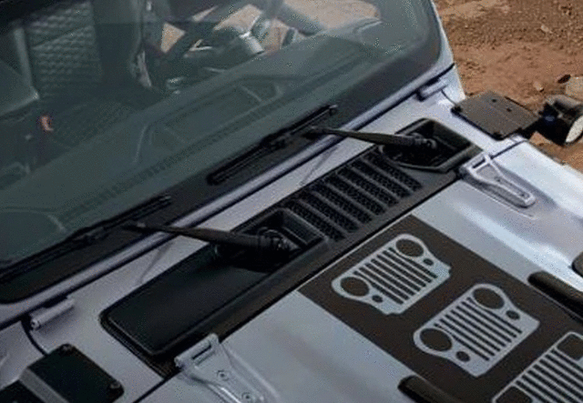 Graphic fits Jeep Wrangler and Jeep Gladiator Rubicon hood. Hood graphic featuring multi-Jeep grille design. Graphic is low gloss black, vinyl material that is a wet adhesive application.