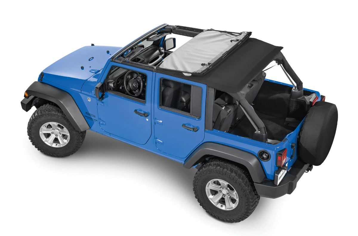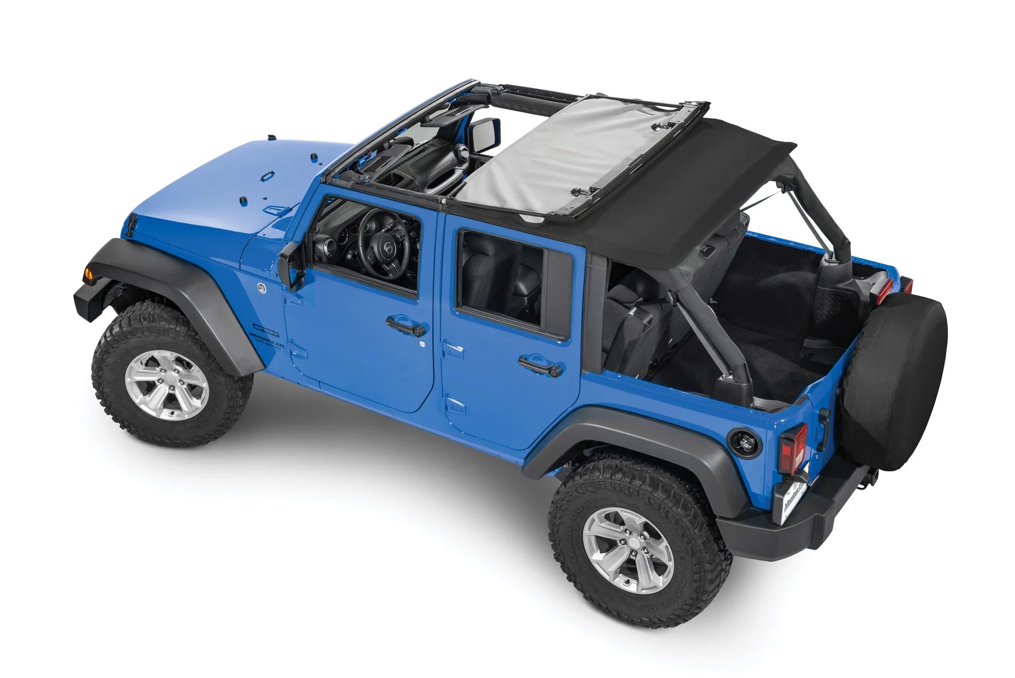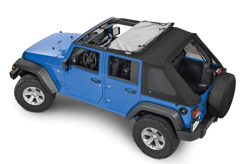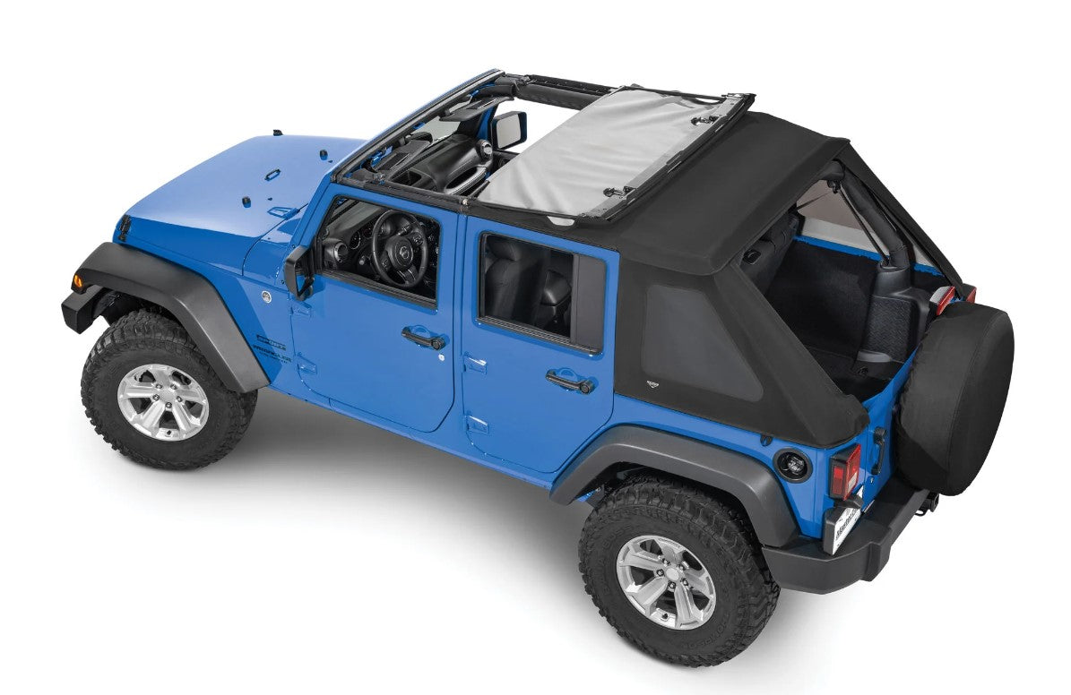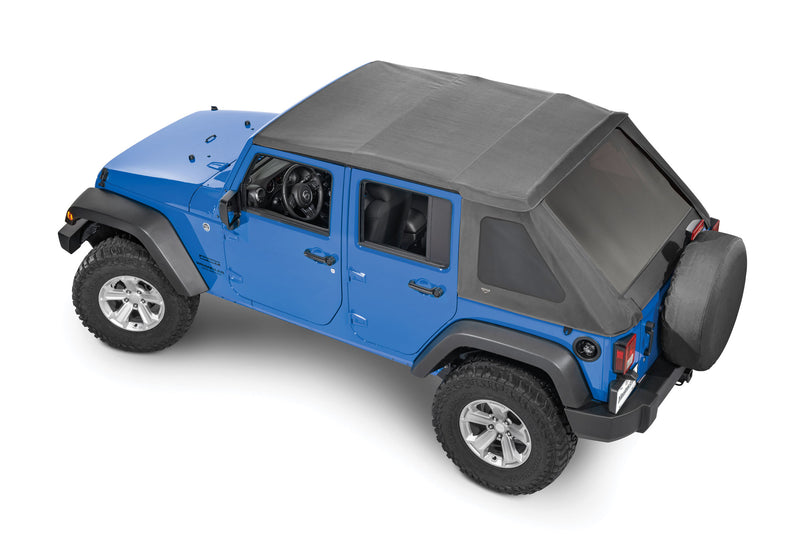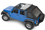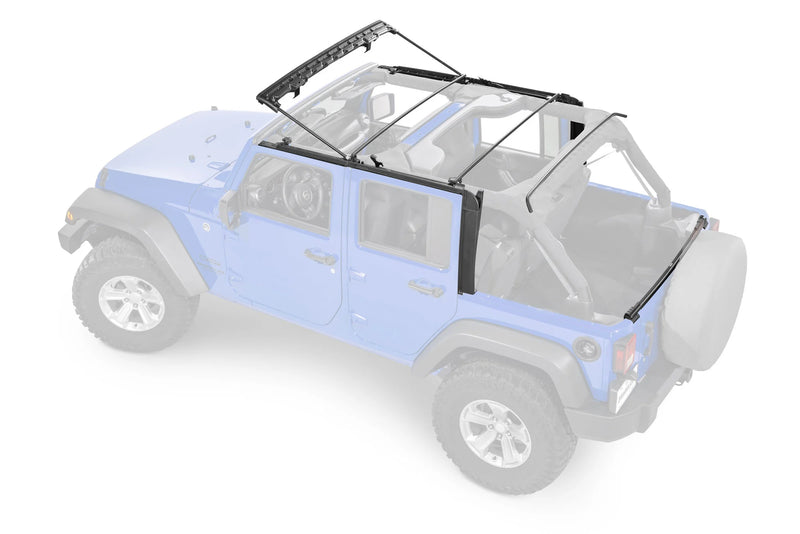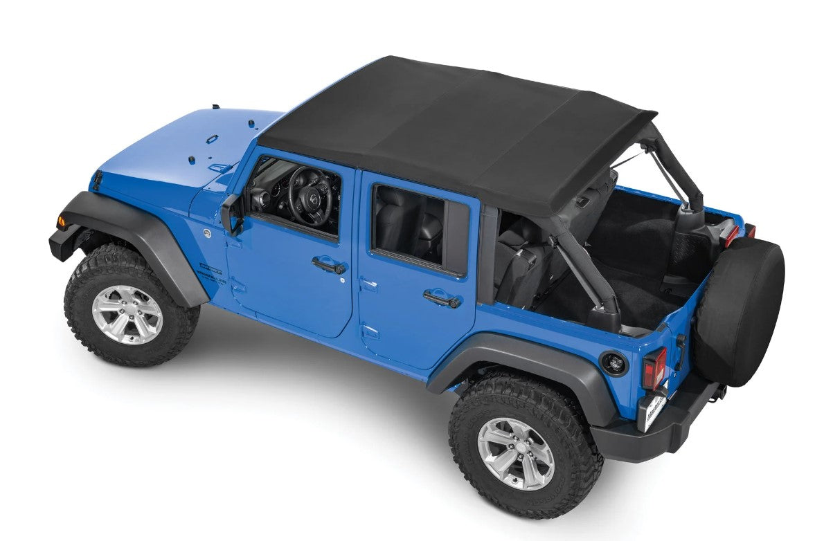Complete Top Setup: This complete top kit includes all of the necessary components for installation on your Wrangler JK Unlimited. New Topdeck, door surrounds, tailgate bar and the front flip-back bow assembly make this kit a must-have to enjoy the open air.