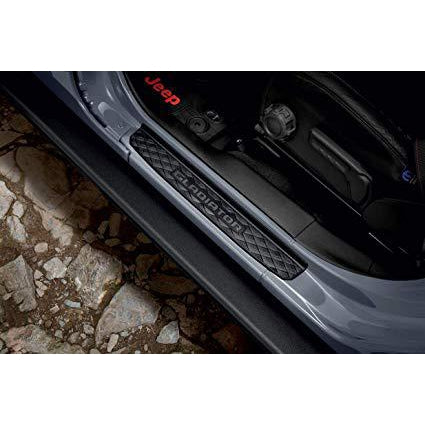 Door Sill Guards are an additional protection against scratches and scuffs. These durable, black plastic guards feature the Gladiator logo. They pass all production testing, including water immersion, cleanabilty, extreme temperatures, weathering, soiling, automotive fluids resistance, and scratch resistance. They do not interfere with door or door seal function. Set of four.