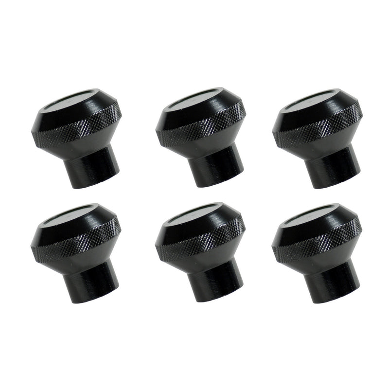 Dress up your interior and add a custom touch with these billet knobs. Billet stainless steel construction with a black powdercoated finish. Sold as a set of 6 knobs.