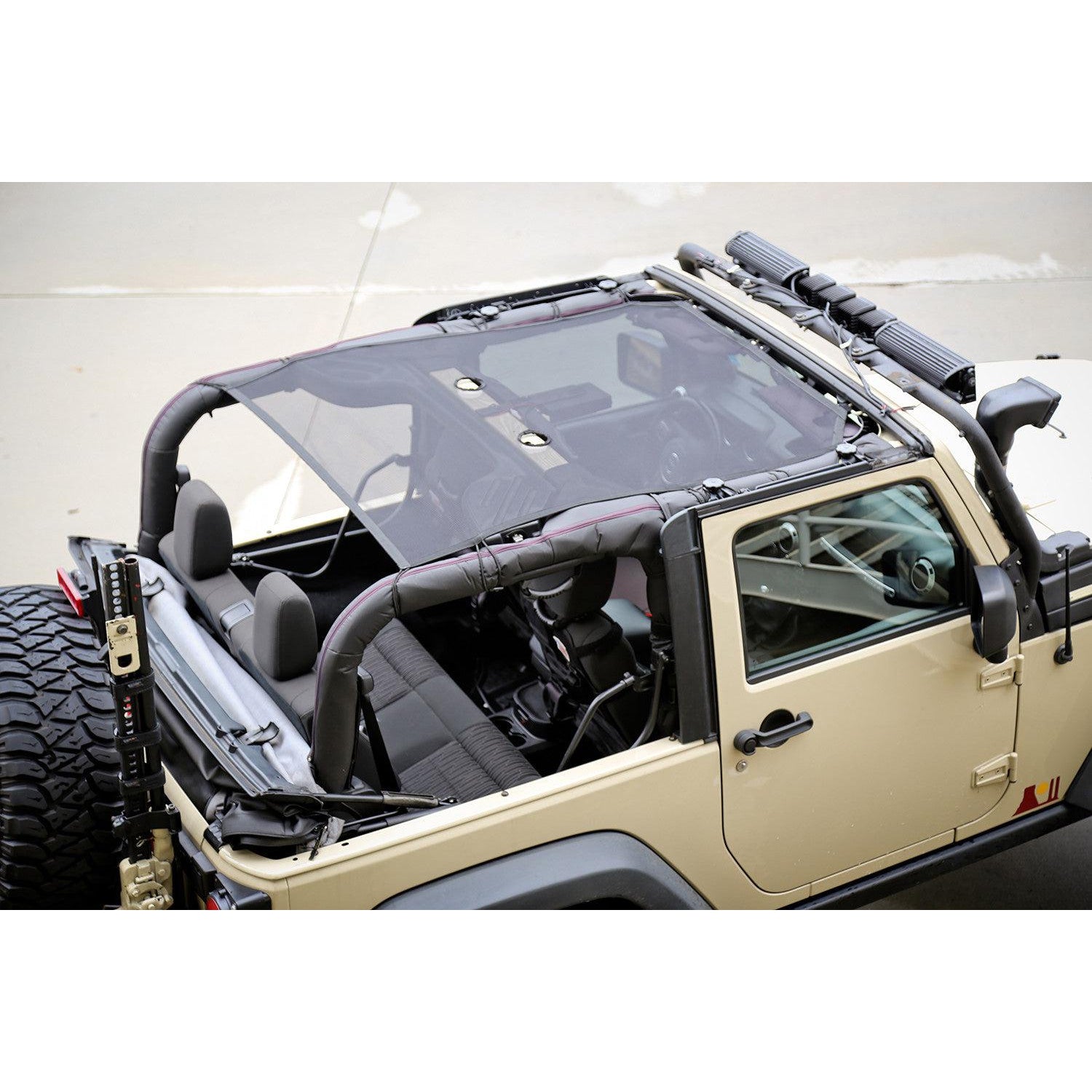 Protects passengers from the sun. Works with factory top still attached. Simple bungee ball attachments. Included mesh carry bag. Limited 5 Year Warranty. Less than 1 hour.
