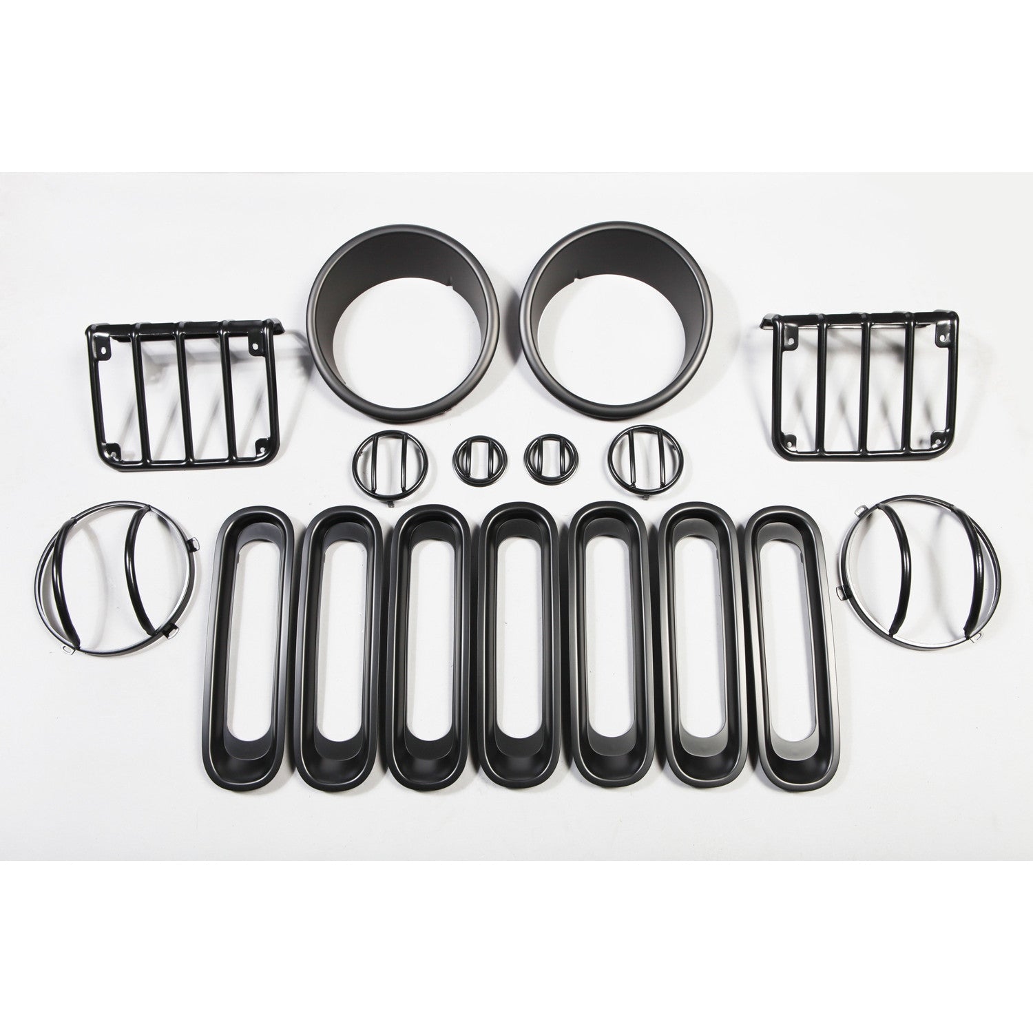 Black, UV treated Euro Guard Light Kit fits 2007-2018 Wrangler JK. 17 piece kit includes headlight, side marker, turn signal, grille inserts and headlight trim. Limited 5 Year Warranty. 1+ hours.