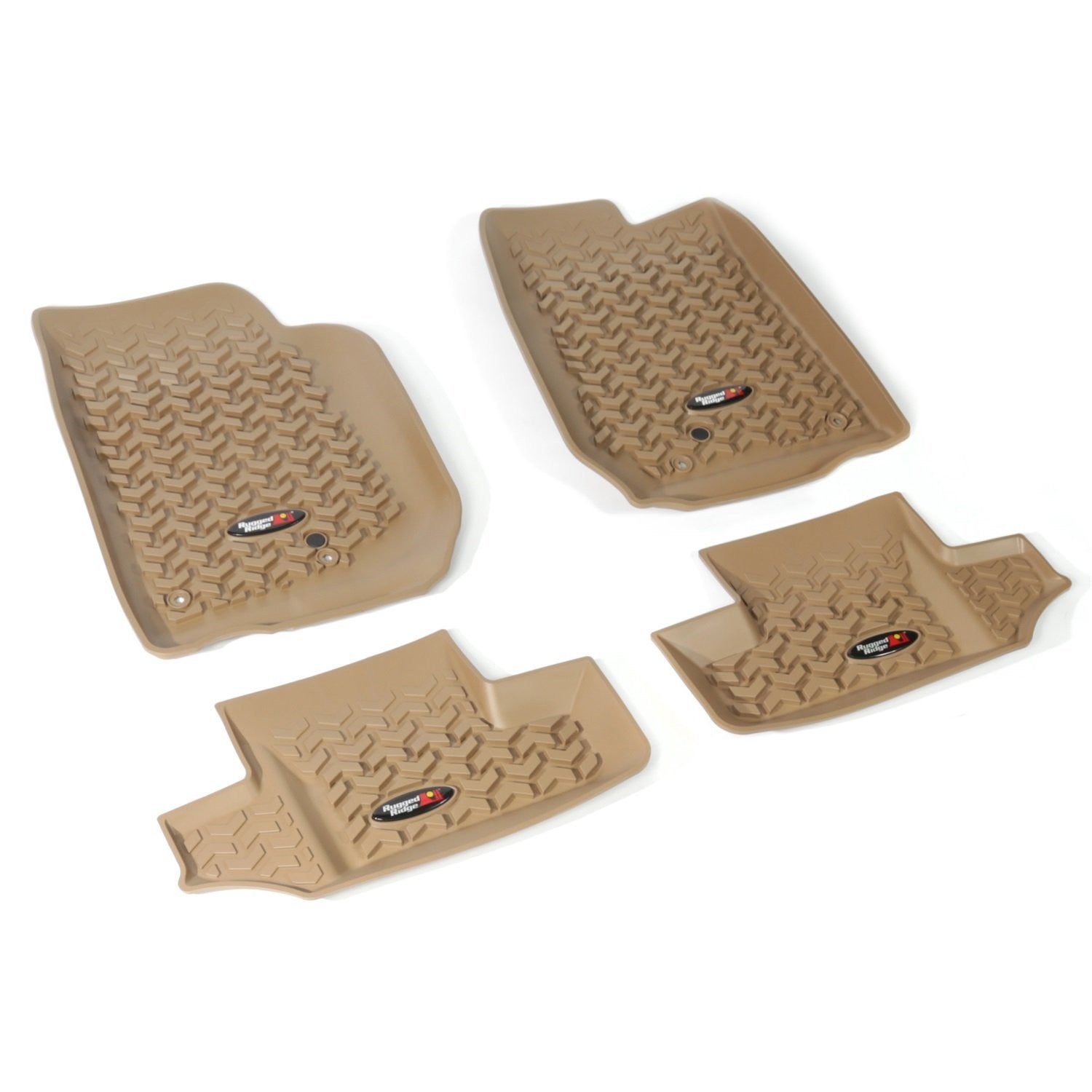 4-Piece tan floor liner set for 2 door Wranglers, 2007-2018. 2 front and 2 rear mats. High perimeter wall provides maximum protection. Rolled reinforced edges for added strength. Durable OE-quality Thermoplastic. Nibbed bottoms for secure fitment. Less than 1 hour.