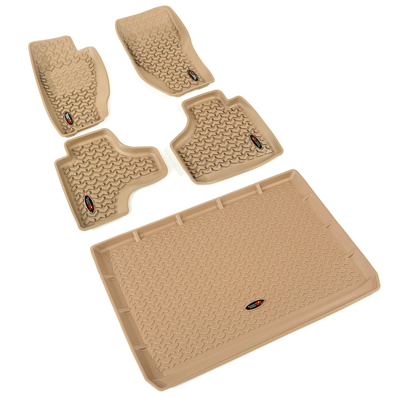 Need an affordable solution to keep the floors of your SUV looking factory fresh? This five piece tan All Terrain Floor Liner Kit from Rugged Ridge includes the front, rear, and cargo liners. Featuring a durable OE-quality thermoplastic material that can withstand the rigor of daily abuse, each liner is perfectly contoured to your vehicle's floor for precise secure fitment (floor hook attachment where applicable). The raised lip captures all spills, water and debris keeping your interior pristine. Features a chevron shape patented deep tread technology.