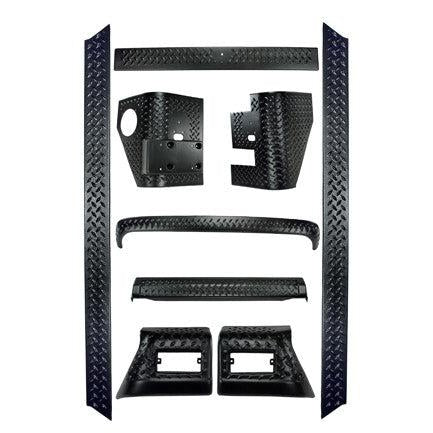 Black Diamond Plate Thermoplastic. Fits 1997-2006 Jeep Wrangler TJ. UV Treated. Attaches with automotive grade double sided tape. 9 piece kit. Covers typical scratched and dented areas. 1+ hours.