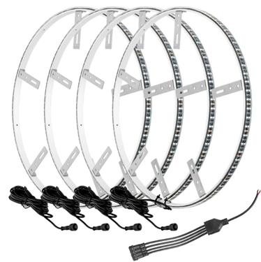 NEW! Double the LEDs… Double the Brightness! Are you looking for the brightest and most attention-grabbing LED wheel ring kit on the market? Look no further than the all-new Double-Wide LED Wheel Ring Kit from ORACLE Lighting! With over 600 LEDs these rings make a powerful impact on any vehicle! The all-new design features “Plug and Play” waterproof connectors for easy installations. Each ring has over 12’ of insulated cable that connects to a wiring hub which makes installation easier than ever. The rings now include (5) mounting brackets per ring and have tapped fittings to easily move and adjust brackets to fit any application. The ring diameter has been increased to 16.5” to fit oversized performance brake systems. ORACLE Lighting illuminated LED wheel rings are an easy and effective way to light up your truck’s wheels and suspension! This head-turning lighting product consists of a set of (4) LED illuminated aluminum rings which install around the brake rotor and attaches to the brake dust shield. These can also be mounted to older vehicles with drum brakes. The effect is a large ring of light which accents custom wheels and stands out at events. Oversized 16.5” diameter is the largest on the market and fits oversized brakes. Each ring is equipped with 162 super-bright 2835 LEDs (648 LEDs total) which will outshine any competitors.Features: 2x Brighter than Standard! Universal Vehicle Fitment. LED Ring Diameter: 16.5”. Mounts to Brake Dust Shield. Operating Voltage: 12V DC. Super Bright 2835 LEDs. 1 Year Warranty. Contents: (4) LED Wheel Rings. (20) Stainless Brackets. (20) Installation Screws. (4) Waterproof Cables. (1) Easy Wiring Hub. (1) LED Rocker Switch. Installation Instructions & Video.