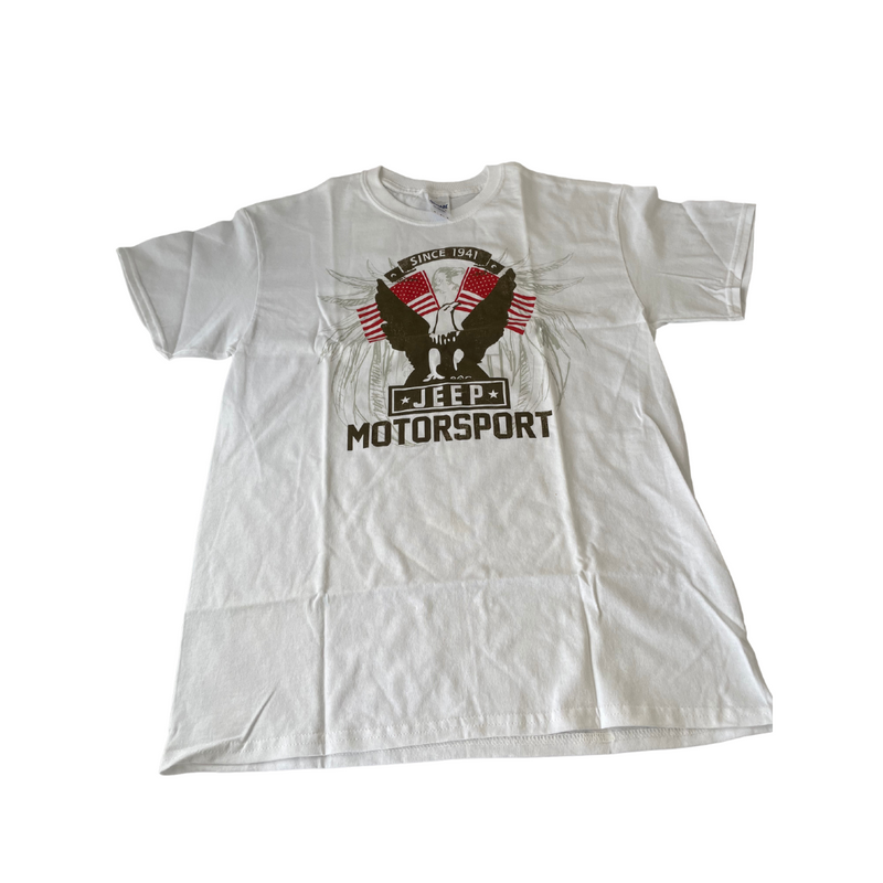 Vintage Americana graphic eagle, Jeep Motorsport logo on chest.