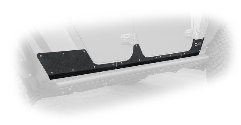 The DV8 Offroad SRGL-05 Rock Skins can be used with any Gladiator step or slider and contour around either factory or aftermarket fenders. They are designed to add protection to the exposed are of the body between the door and the bottom of the body which is one of the most susceptible areas on any Jeep for trail damage.