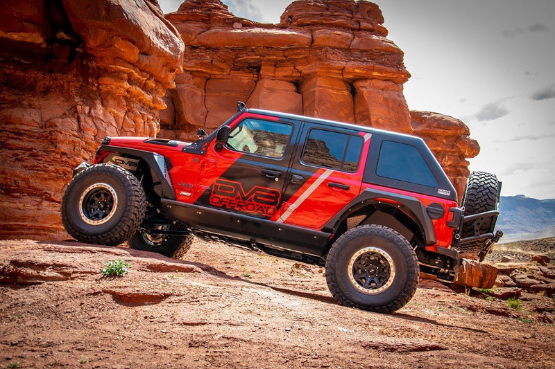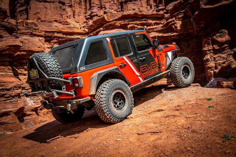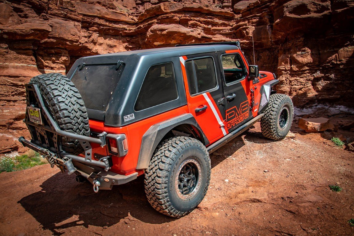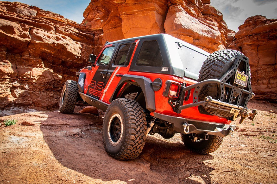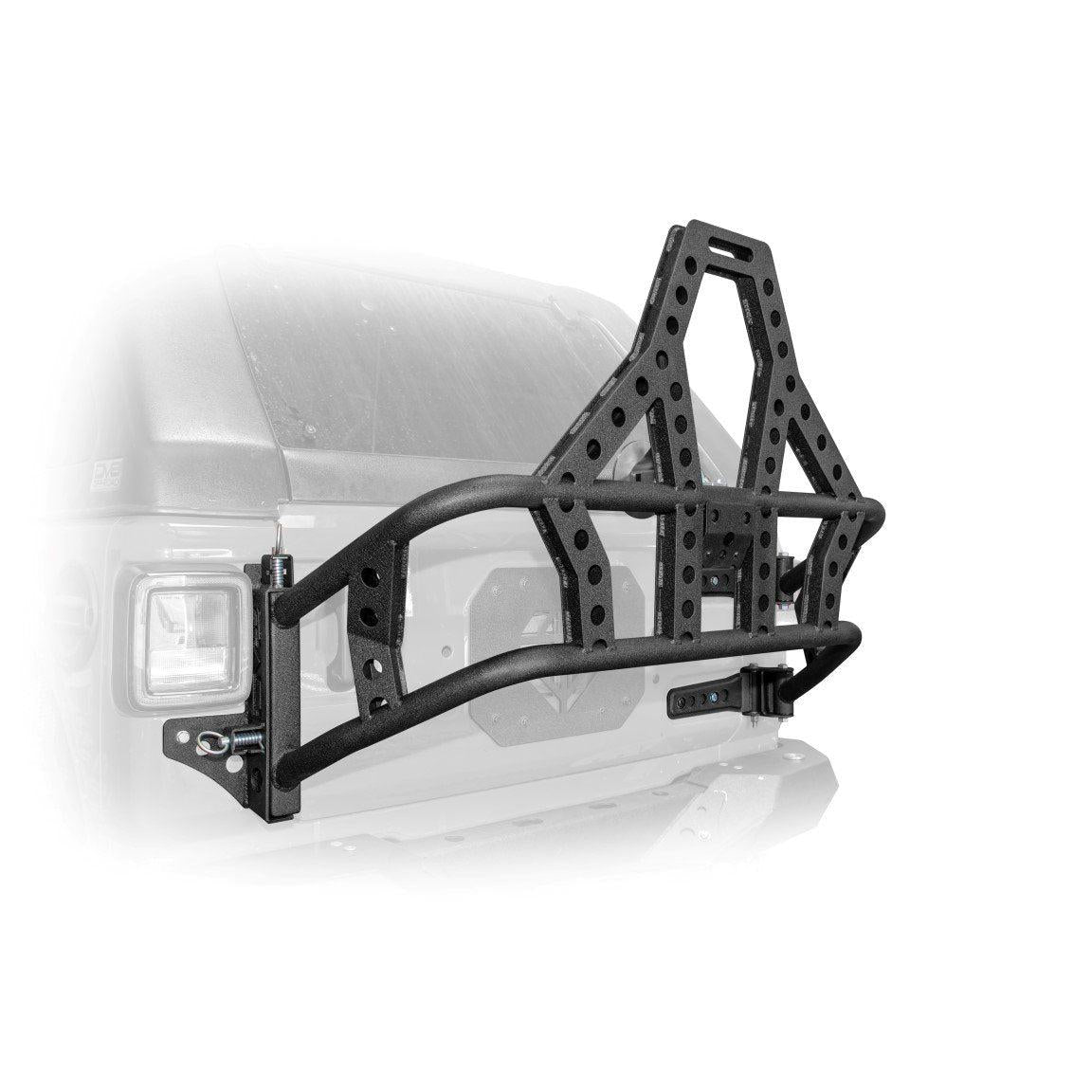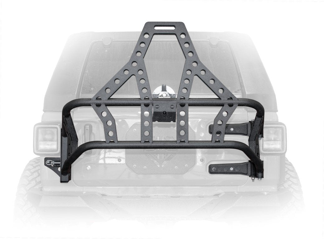 The DV8 Offroad TCJL-02 uses a combination of tubing, boxed steel and internal bracing to accommodate up to a 42 inch tire and wheel combo and can be used with any rear bumper. DV8 used a spring loaded pin system to make opening and closing the tire carrier so easy that it can be done with one hand full. The tire carrier accommodates the OEM back-up camera.