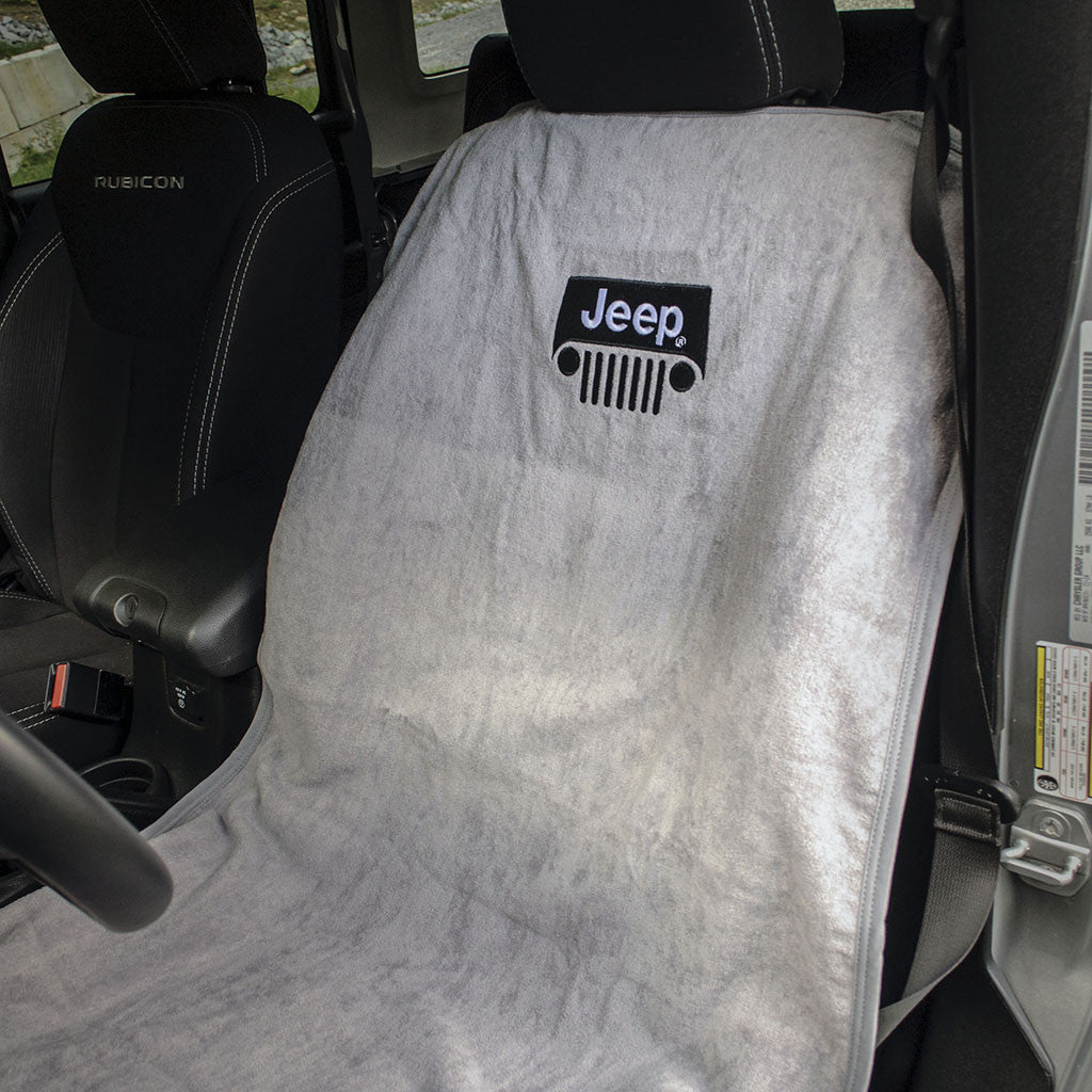 This Gray Jeep seat towel with Jeep Grille Logo offers a quick way to protect driver side and passenger seats from many of the things that make life great: