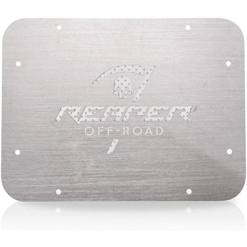 Show your Reaper pride with this Tailgate Cover from Reaper Off-Road. This high quality product is made high quality .060 5052 aluminum. This spare tire delete features a drilled brushed finish backing plate for ventilation. Front cover is available uncoated ready for your custom paint job.