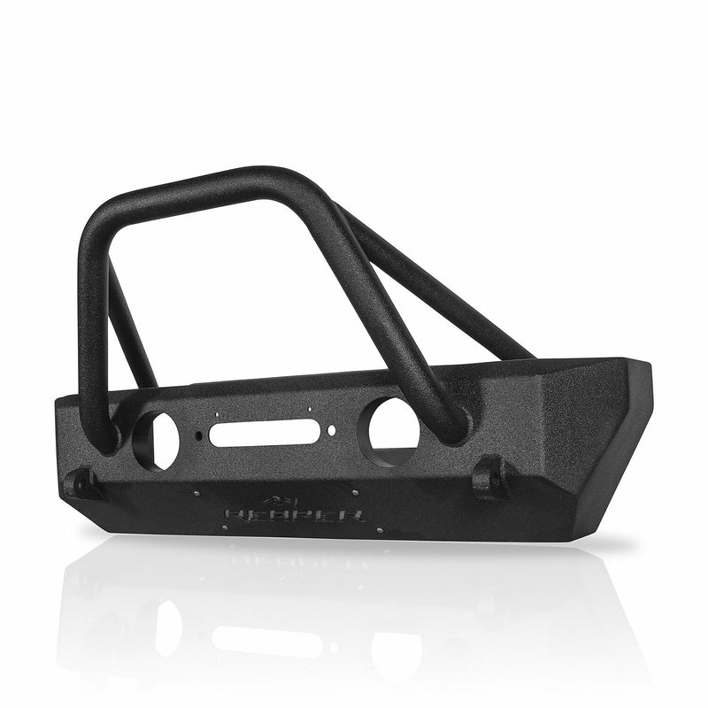 When looking for a replacement bumper on your Jeep, look no further than Reaper Off-Road. Featuring a bull bar guard to protect the grill, recessed winch mount, and room to retain your factory style fog lights. This high quality bumper is made with an aggressive narrow design to allow for steep approach angles. Made from heavy duty 3/16” flat steel and welded both inside and out for superior strength and durability. Includes mounting studs for ease of installation and does not require frame modification. Coated with a durable two-stage textured black coating to resist the knicks and scratches. Upgrade your Jeep today with some rugged parts from Reaper Off-Road!