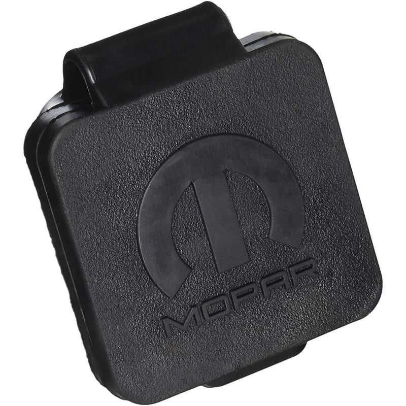 Description: Hitch plug, hard rubber, for hitches with a 2" opening, includes retention strap & 4-way wiring plug holder, with Mopar logo.