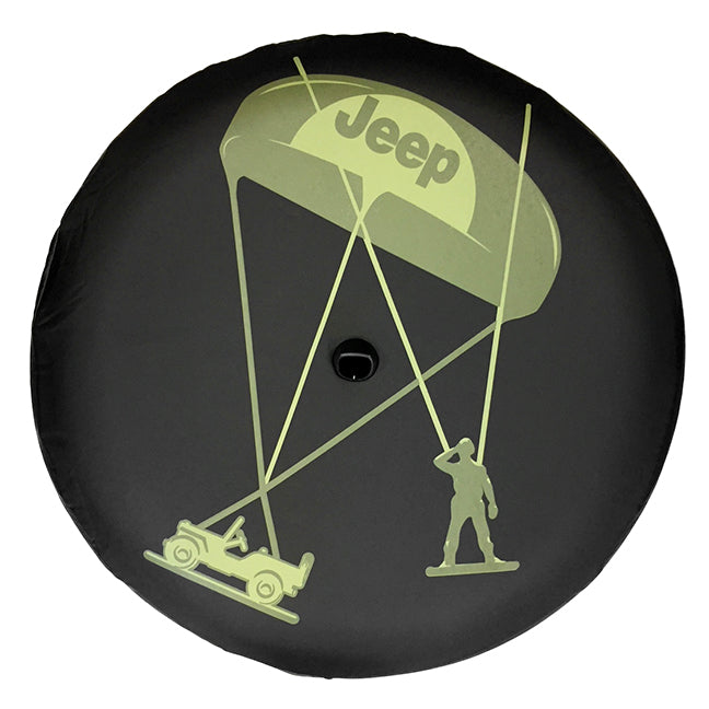 The Willy's Logo Spare Tire Cover from Mopar is made of a Black Vinyl material with the Willy's Logo in olive green and features an elastic anchor to securely hold the cover on the tire. The built in plastic collar for around the rear view camera helps to center the tire cover in place. These covers are custom fit for 32" tires (245/75R17 and 255/70R18) and are designed specifically for the Wrangler JL's backup camera.
