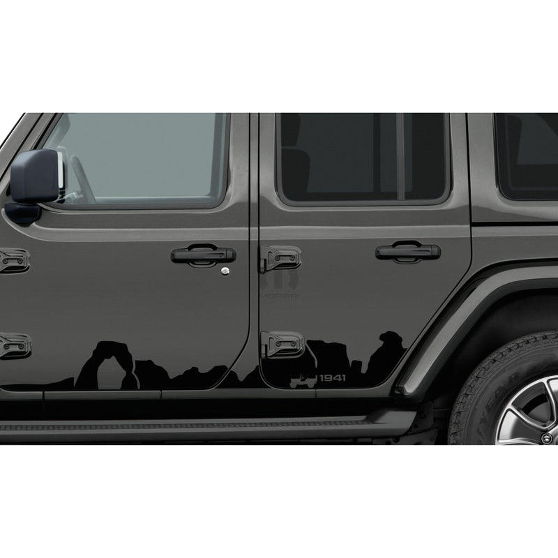 Additional Details: Bodyside Graphic extends the length of the vehicle on both sides. The design is the Jeep mountain image in low gloss Black. Fits 2 door Jeep Wrangler (JL).