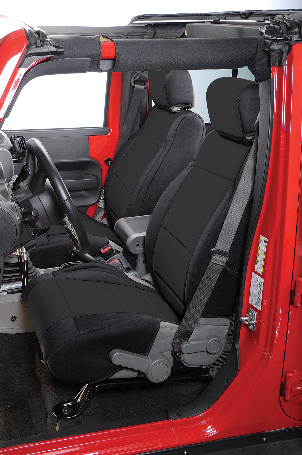 Protect your Jeep's interior with these great Custom Fit Neoprene Seat Covers from Rugged Ridge. These covers are constructed of durable neoprene creating the best looking custom seat cover available. Rugged Ridge does not use that cheap stretch nylon on their seat covers! Neoprene (wet suit material) is a great fabric to protect your seats from dirt, water and whatever mother nature can throw at you. No more burned legs from hot vinyl seats! Each cover is custom tailored for your Jeep's original equipment seat style making your seats look like they have been recently re-upholstered. Installation is easy with special designed elastic cords, nylon straps and hooks that attach to your seat and to the seat cover mounting points. Will not fit leather seats.
