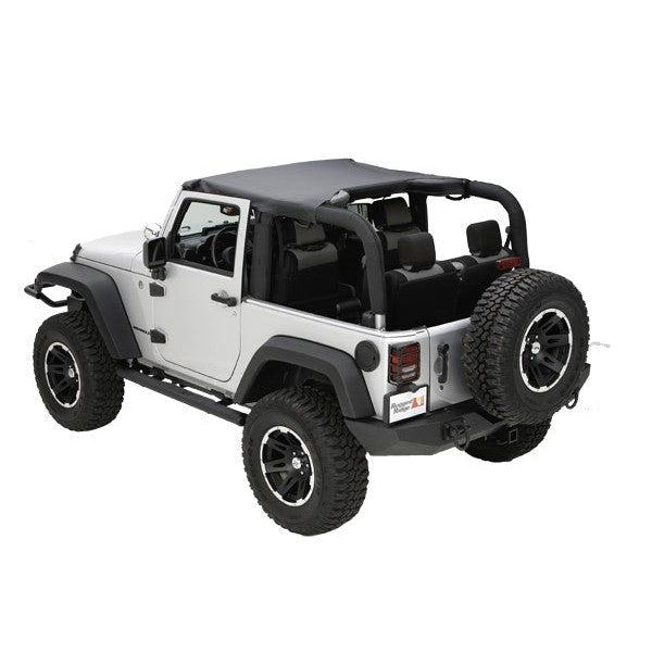 Black Diamond pocket brief for 2010-18 Jeep Wrangler JK. Contains 2 mesh pockets sown into front corners. Covers front seats. Secures to center roll bar. Can be used with factory header. Less than 1 hour.