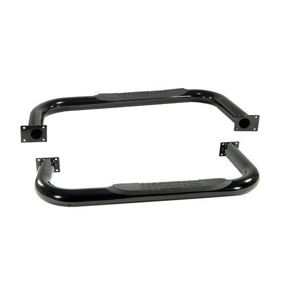 Complete the look of your Wrangler with a set of Rugged Ridge tough duty side steps. Each side step is designed to be mounted to the frame of your Jeep creating a no-bounce secure fit. Each side step has a durable no-slip step pad that is specially mounted to the tube with rust-proof fasteners for long life and durability. Side steps carry a 300lb max weight limit.
