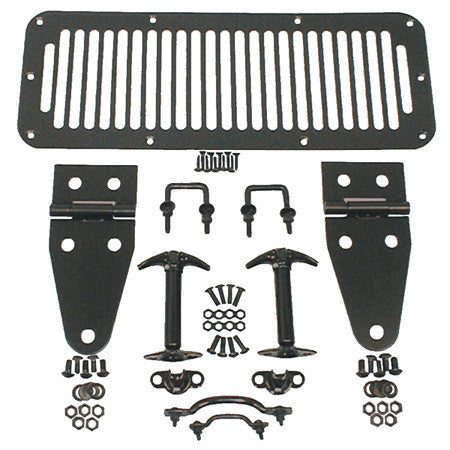 Improve the look of your Jeep with these genuine Rugged Ridge black exterior accessories for your hood! The Wrangler Hood Dress Up Kit is powder coated and finished with a durable semi gloss finish to help protect your assets against the outdoor elements. The hood kit includes a set of Hood Hinges, Windshield Tie Down Kit, Hood Vent, Footman Loop, and Hood Catches.