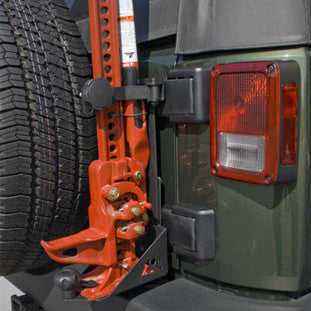 This Jeep Wrangler JK Off-Road Jack Mount allows you to carry your Off-Road jack on the outside of your vehicle saving precious cargo space. Fast and easy bolt on installation. Compatible with stock and most aftermarket rear bumpers (without tire carriers) as well as Rugged Ridge XHD rear bumper with or without tire carrier. The bracket is sturdy and secures the jack in two locations to eliminate any vibration noise during vehicle operation. Durable textured finish looks great. Fits most off-road style jacks including Hi-Lift.