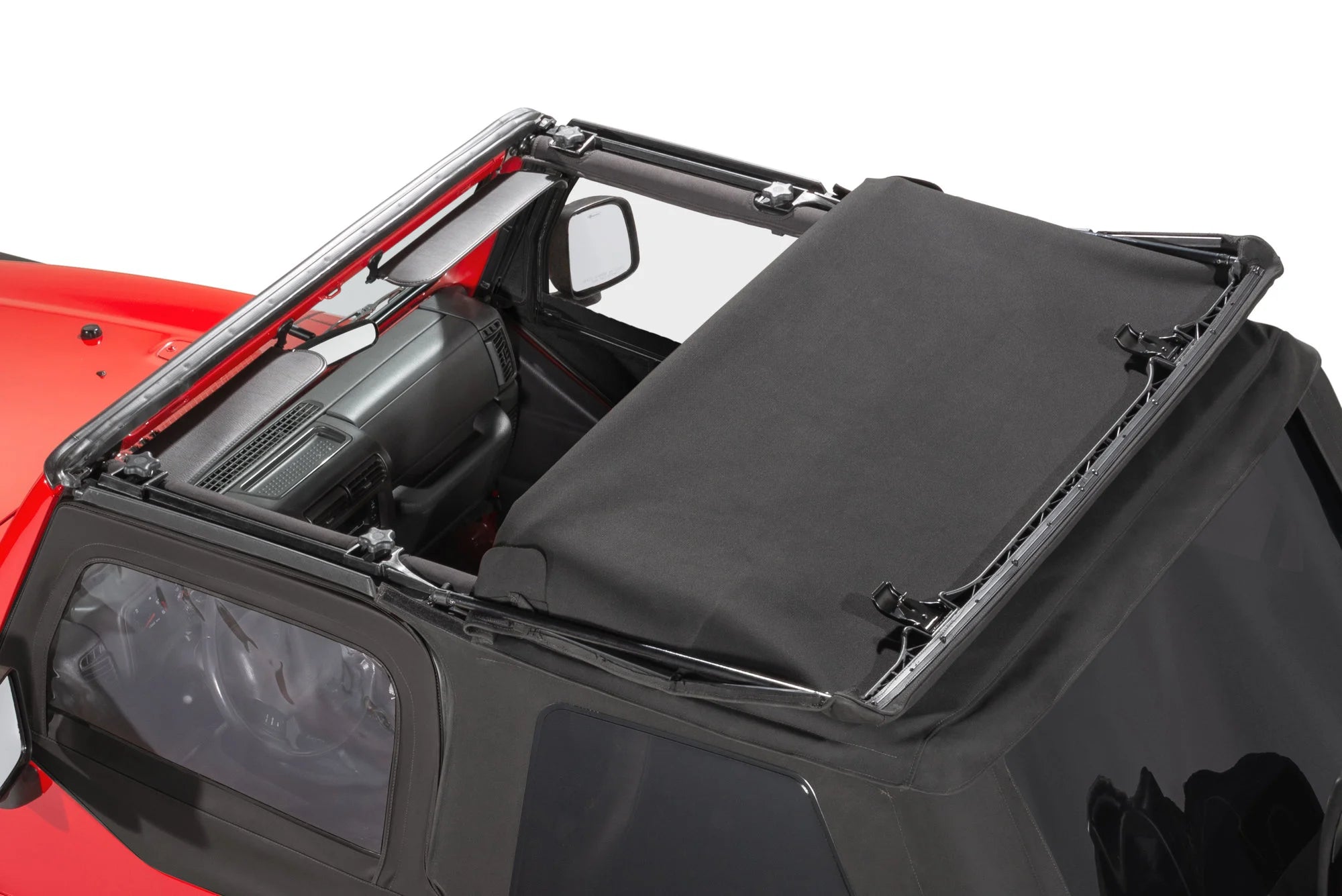 Multiple options: The SkyMaster® Frameless Fastback top can be used as a fully enclosed soft top, or easily flip back the front section for the front seat passengers can enjoy open-air driving. All three windows can be zipped out and the SkyMaster transforms into a full-length bimini top.