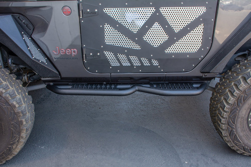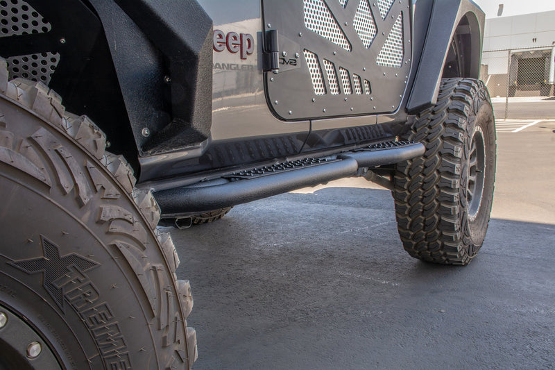 The DV8 Offroad SRJL-22 sliders are a trail tested and proven design. Made from .160 wall 2" steel tubing and completely bolt on, no drilling required. These steps are designed to be high clearance so that they assist you when entering and exiting the Jeep but also don’t hang up on obstacles offroad. Easy installation, no modifications needed and they utilize factory hardware.