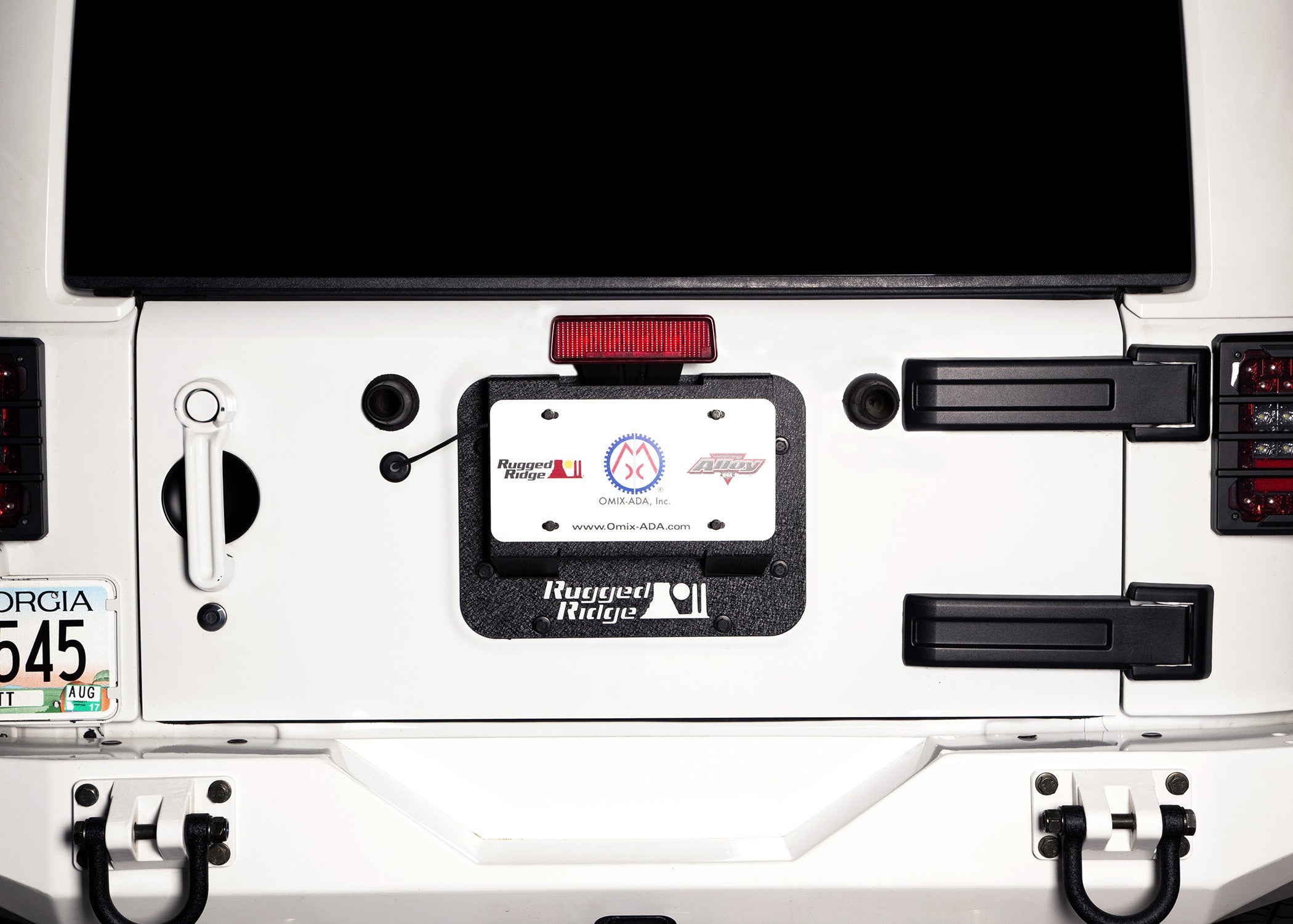 This tire carrier delete kit allows relocation of third brake light and license plate from Rugged Ridge fits 2007-2018 Wrangler JK.