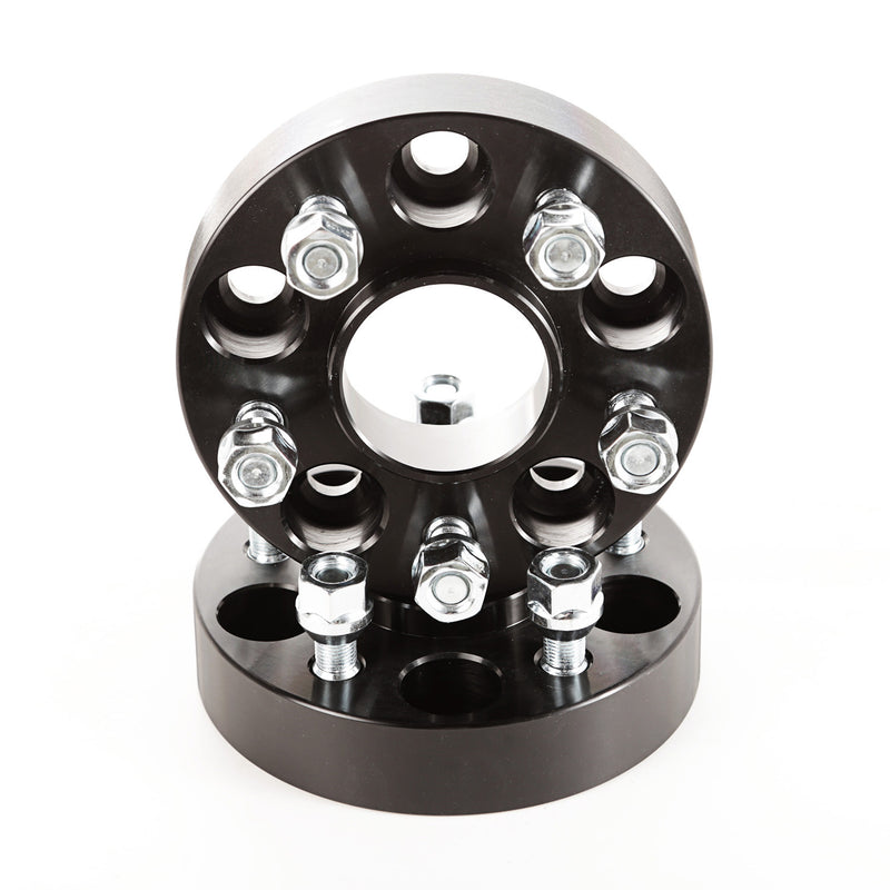 Rugged Ridge wheel spacers are the solution to clearance issues when fitting wider tires on your Jeep, while also increasing track width for improved stability on and off-road. This set of black hub-centric 1.25-inch wheel spacers from Rugged Ridge has a 5 x 110 mm bolt pattern and 65.1 mm bore diameter. The hub-centric construction ensures the wheel is precisely centered on the hub or axle, minimizing stress on wheel studs and eliminating vibrations that are common with non-hub-centric designs. Rugged Ridge spacers are constructed of double-anodized, extra-thick 6061-T6 aluminum for long life and superior corrosion resistance. High-strength Grade 8 studs and lug nuts are included for reliable performance.