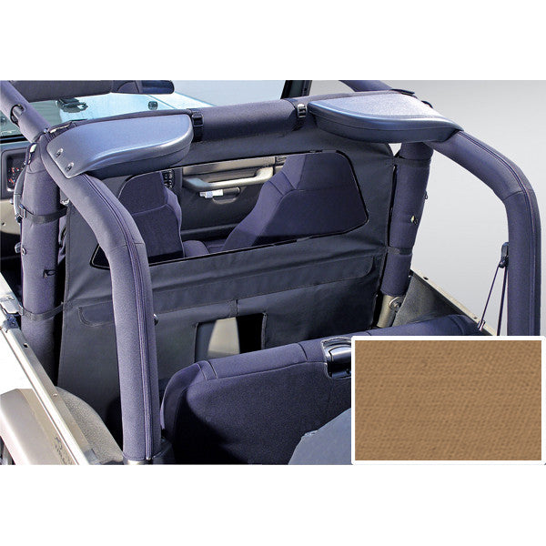 Provides protection from dust, rain and other debris from entering the cab of your Jeep and also keeps heat in during the cold winter months. Easily attaches to the sport bar with durable nylon straps. Constructed of durable soft top fabric that matches other Rugged Ridge Accessories. Special rear opening allows for easy access to cargo area: zips open and closed. DOT approved rear glass allows for rear visibility.