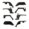 Rugged Ridge Armor Fenders for Wrangler JK 2 door are not just another bolt-on accessory. We developed our Armor Fenders with such a brawny & bold styling; they’re capable of transforming your rig into an unmistakable, attention-grabbing shadow if its former self. High body lines and aggressively arched wheel openings provide greater clearance for larger tires and allow for improved wheel travel and articulation off-road. Each fender is constructed of heavy gauge 3 mm thick steel, utilizing fold-and-weld construction, for greater structural integrity you can appreciate. Each section is meticulously finished with a resilient black textured powder coat that protects from real-world road hazards. The rear Armor fenders revolutionary 2-piece design allows for full encasing of the tail light and allows for a fitment that is free of gaps for tight fitment and unsurpassed protection while the front Armor fenders integrated vent screen helps expel engine heat for better overall performance. Installation is simplified with the addition of our Gen 2 Inner Fender Liners so there’s no need to modify your factory parts in the process. Armor fenders work with all factory components as well as Rugged Ridge Spartan Grill, Aluminum Hood Catches and even Rubicon Rock Rails. Includes marker light assemblies, hardware and complete installation instructions. Patent Pending.